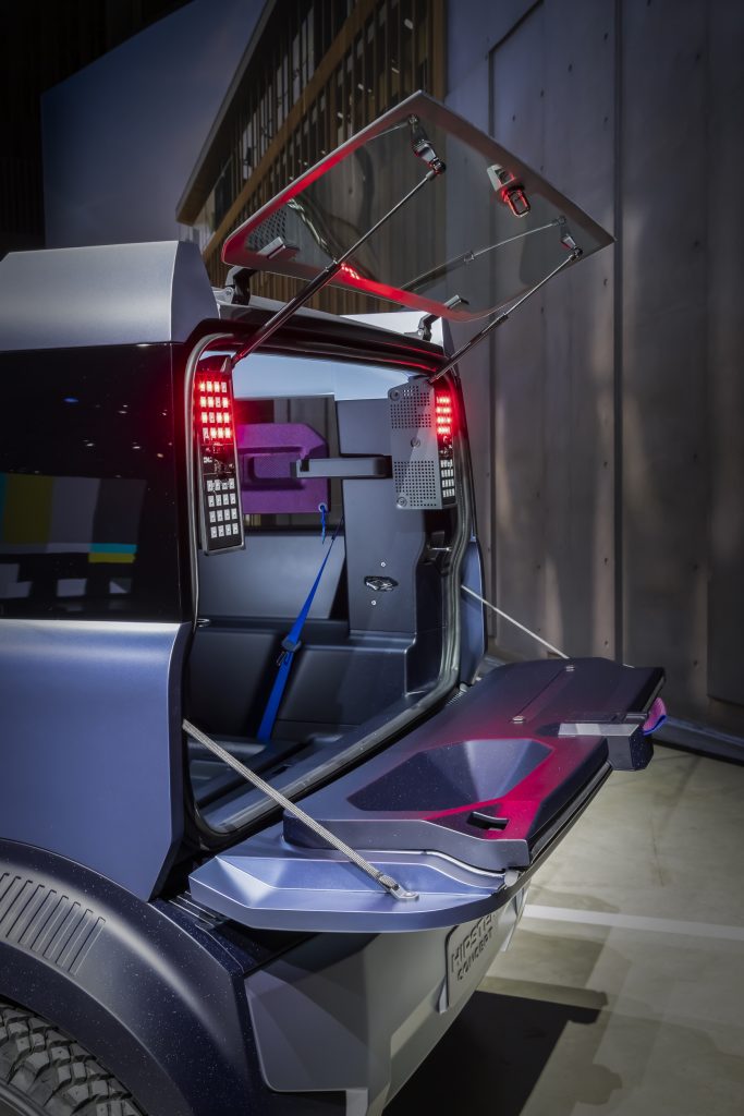 Und der Innenraum? Der zur Verfügung stehende Raum wird konsequent ausgenutzt. Kein Zentimeter soll umsonst sein. Rund um die einfach konstruierten Sitze mit sichtbarem Rahmen und Netzstoff schafft das Glasdach und die senkrecht stehenden Scheiben viel Licht und Raumgefühl. Während man vorn auf einer durchgehenden Bank sitzt, empfangen einen hinten umklappbare Sitze. Unsere erste Sitzprobe: Das ist erstaunlich geräumig innen drin.